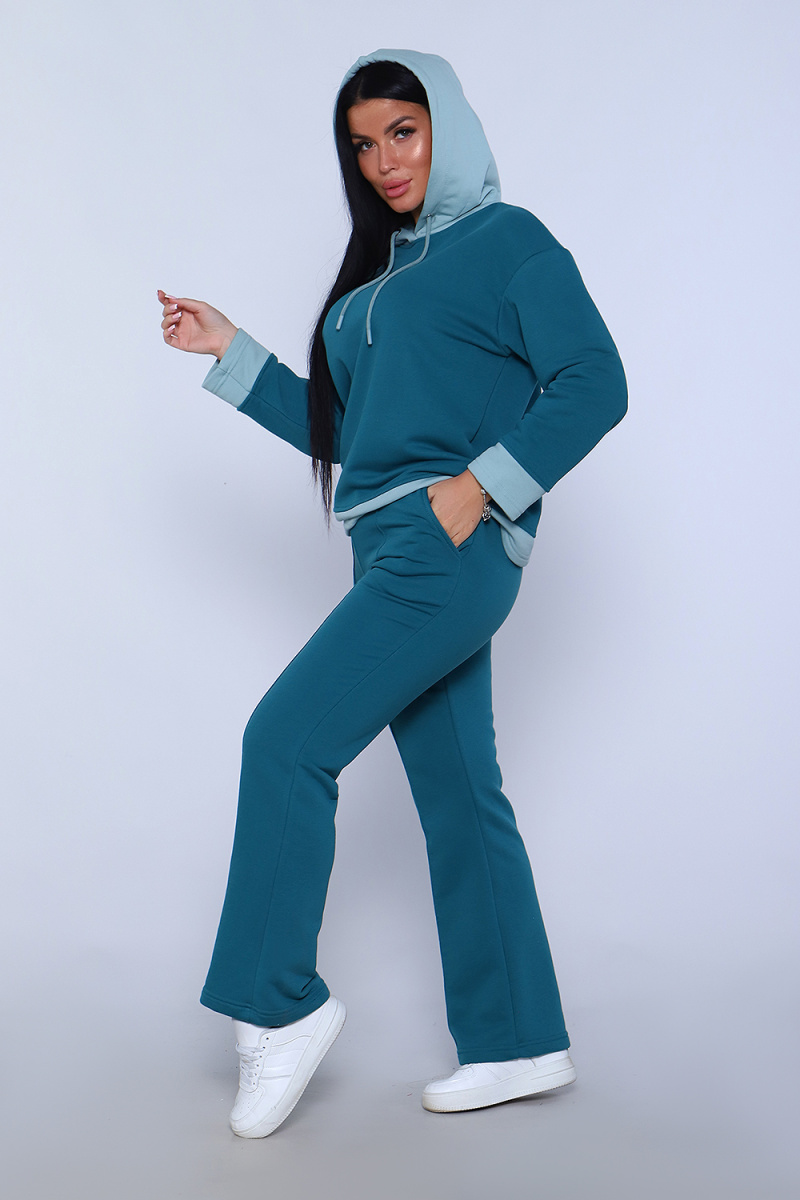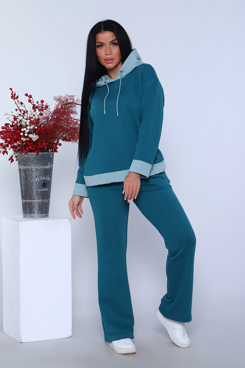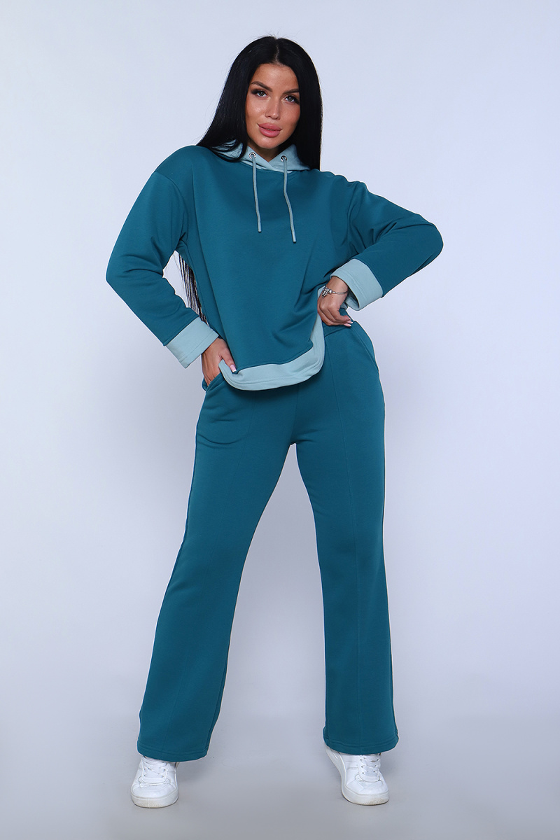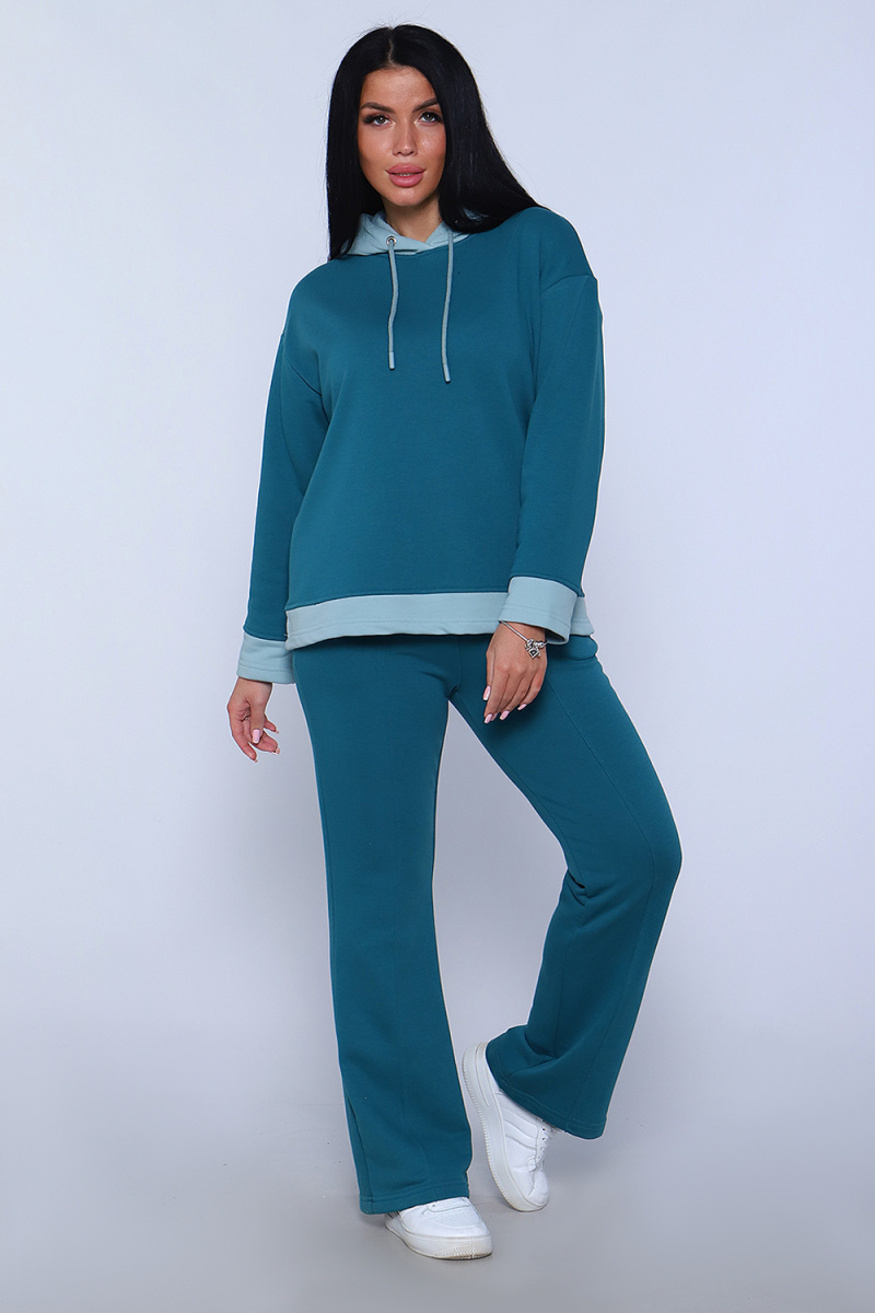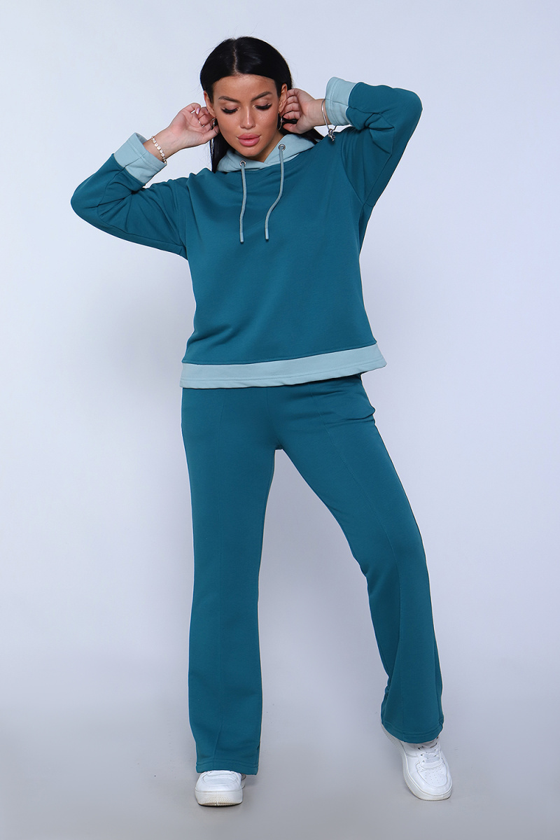 Элегантный женский костюм полуприлегающего силуэта, состоящий из худи и брюк сшит из трикотажного полотна премиум качества - футер 3-х нитка петля без начеса. Высокое качество ткани обеспечит комфорт и удобство на долгое время. Хлопковая изнаночная сторона изделия дарит комфортные ощущения при ношении костюма. Брюки силуэта клеш с широким поясом с декоративной отсрочкой и с отстроченной стрелкой на передней половине брюк, что "вытягивает" силуэт и визуально делает ноги длиннее, что добавляет женственности образу. В боковых швах брюк расположены карманы с отрезным бочком. Худи прямое, свободное с длинными рукавами. Низ рукава и низ худи отделаны декоративными манжетами контрастного цвета. Вырез горловины округлый, с двойным капюшоном контрастного цвета в тон манжет. Объём капюшона регулируется декоративным шнурком. Сочетание комфорта и стиля делает этот костюм модным и удобным для каждой девушки и женщины. Идеальный комплект обеспечивает удобную посадку на любую фигуру, позволяет свободно двигаться, гулять, от
