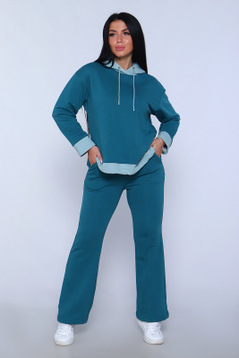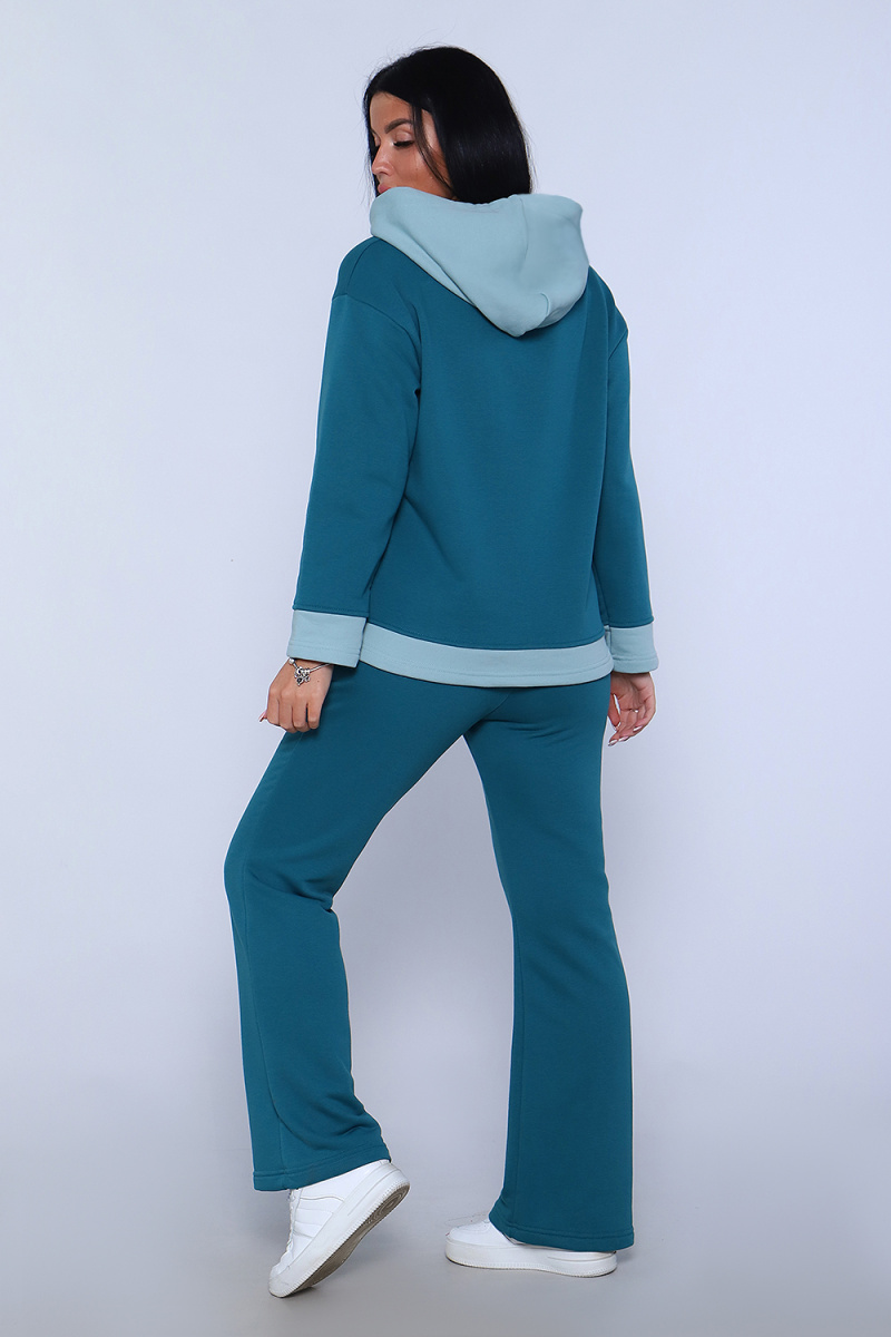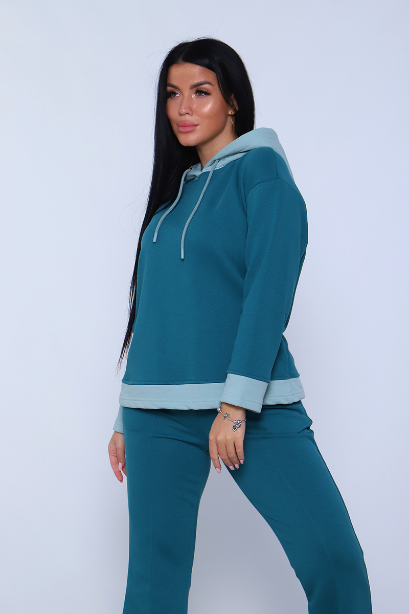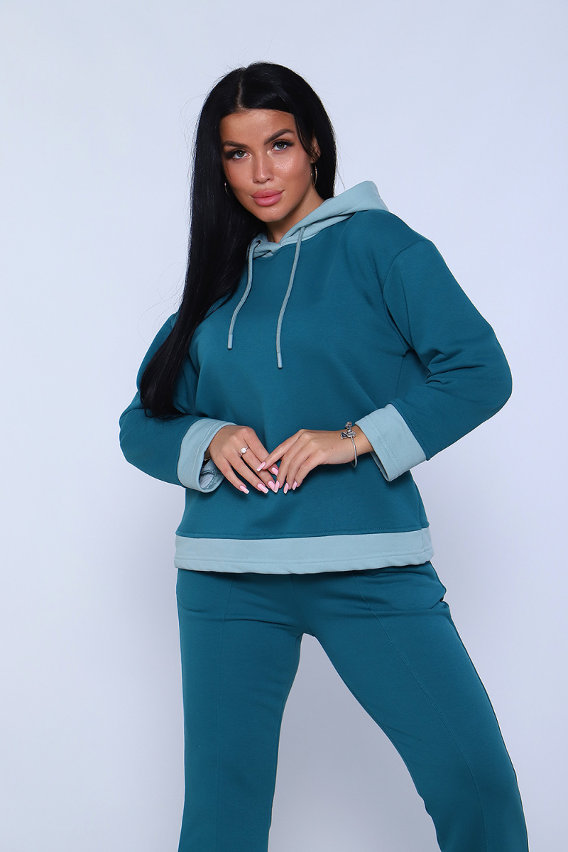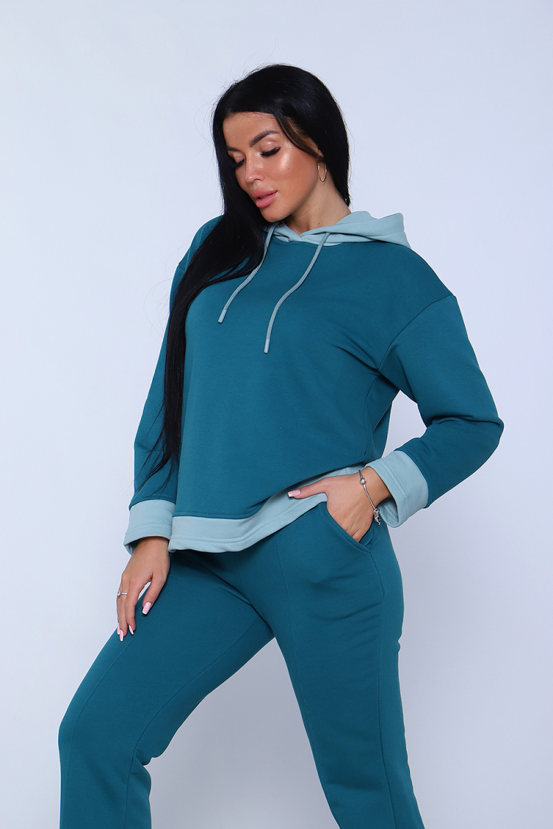 Элегантный женский костюм полуприлегающего силуэта, состоящий из худи и брюк сшит из трикотажного полотна премиум качества - футер 3-х нитка петля без начеса. Высокое качество ткани обеспечит комфорт и удобство на долгое время. Хлопковая изнаночная сторона изделия дарит комфортные ощущения при ношении костюма. Брюки силуэта клеш с широким поясом с декоративной отсрочкой и с отстроченной стрелкой на передней половине брюк, что "вытягивает" силуэт и визуально делает ноги длиннее, что добавляет женственности образу. В боковых швах брюк расположены карманы с отрезным бочком. Худи прямое, свободное с длинными рукавами. Низ рукава и низ худи отделаны декоративными манжетами контрастного цвета. Вырез горловины округлый, с двойным капюшоном контрастного цвета в тон манжет. Объём капюшона регулируется декоративным шнурком. Сочетание комфорта и стиля делает этот костюм модным и удобным для каждой девушки и женщины. Идеальный комплект обеспечивает удобную посадку на любую фигуру, позволяет свободно двигаться, гулять, от